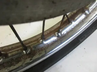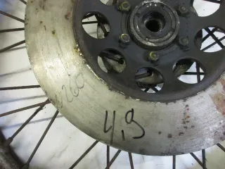 Felgenbett mit Rostansatz, kann aber entfernt werden, siehe Bild, der Reifen sollte altersbedingt erneuert werden. Bremsscheibe 4,90 mm, Durchmesser 260 mm